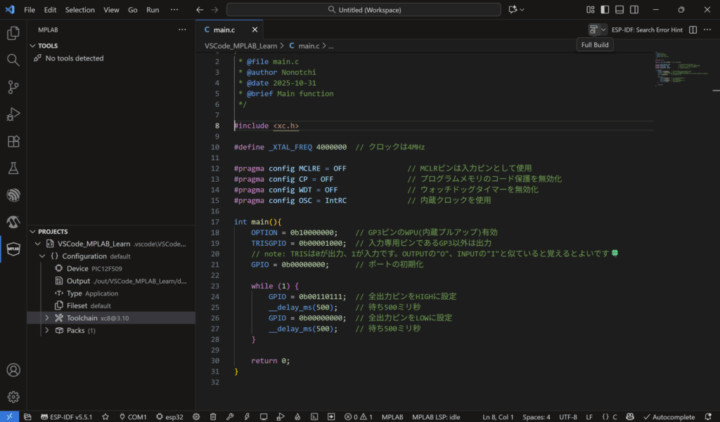 #pragmaの生成機能がないのがかなり不便ですが、VSCodeの慣れた画面で開発が行えるのは良いですね。MPLAB X IDEは個人的に見づらい、使いづらい、眩しい等の不満がありました。