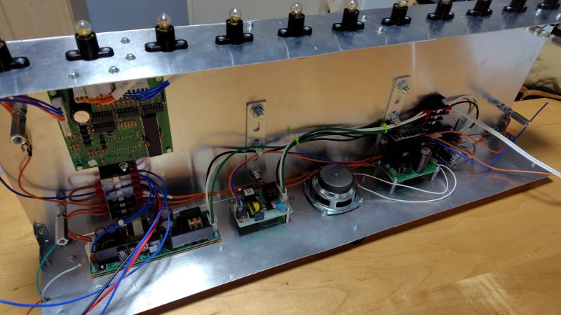 豆電球制御基板、電源、アンプとスピーカー、端子台、リレーを配線しました。豆電球制御基板は、現物合わせ時にスイッチが壊れてしまいました。また買わなければなりません……