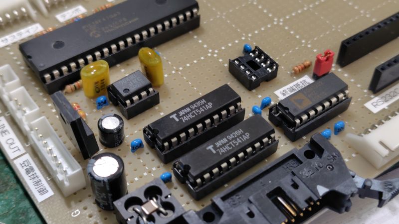 4つのICは、論理積素子(ANDゲート)の74HC08が3つ(12系統分)と、論理否定のインバータ74HC04です。NOTは1個しか使わないため無駄な感じがしますね。